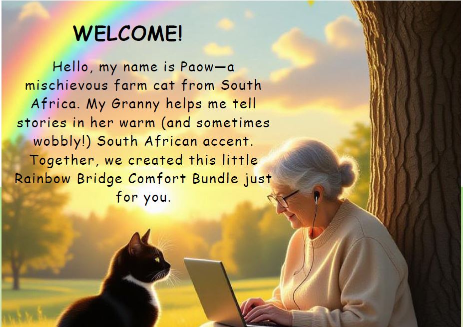 We are Paow, a witty black farm cat from South Africa, and Granny Megan, his warm-hearted storyteller. Together, we create tales that bring laughter, comfort, and connection to cat lovers everywhere.
